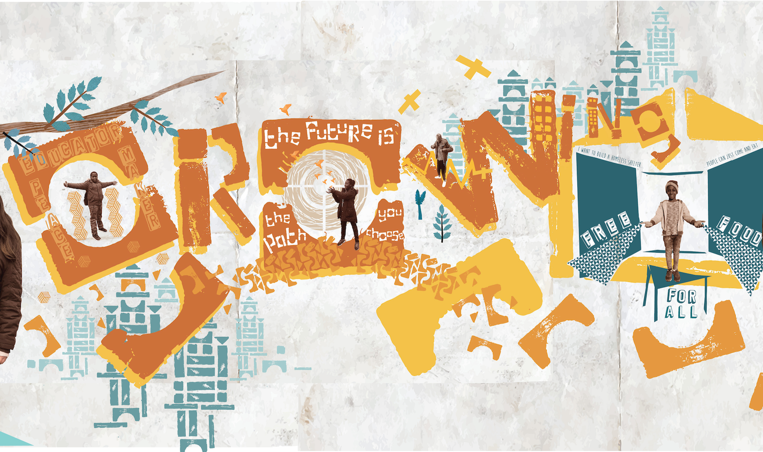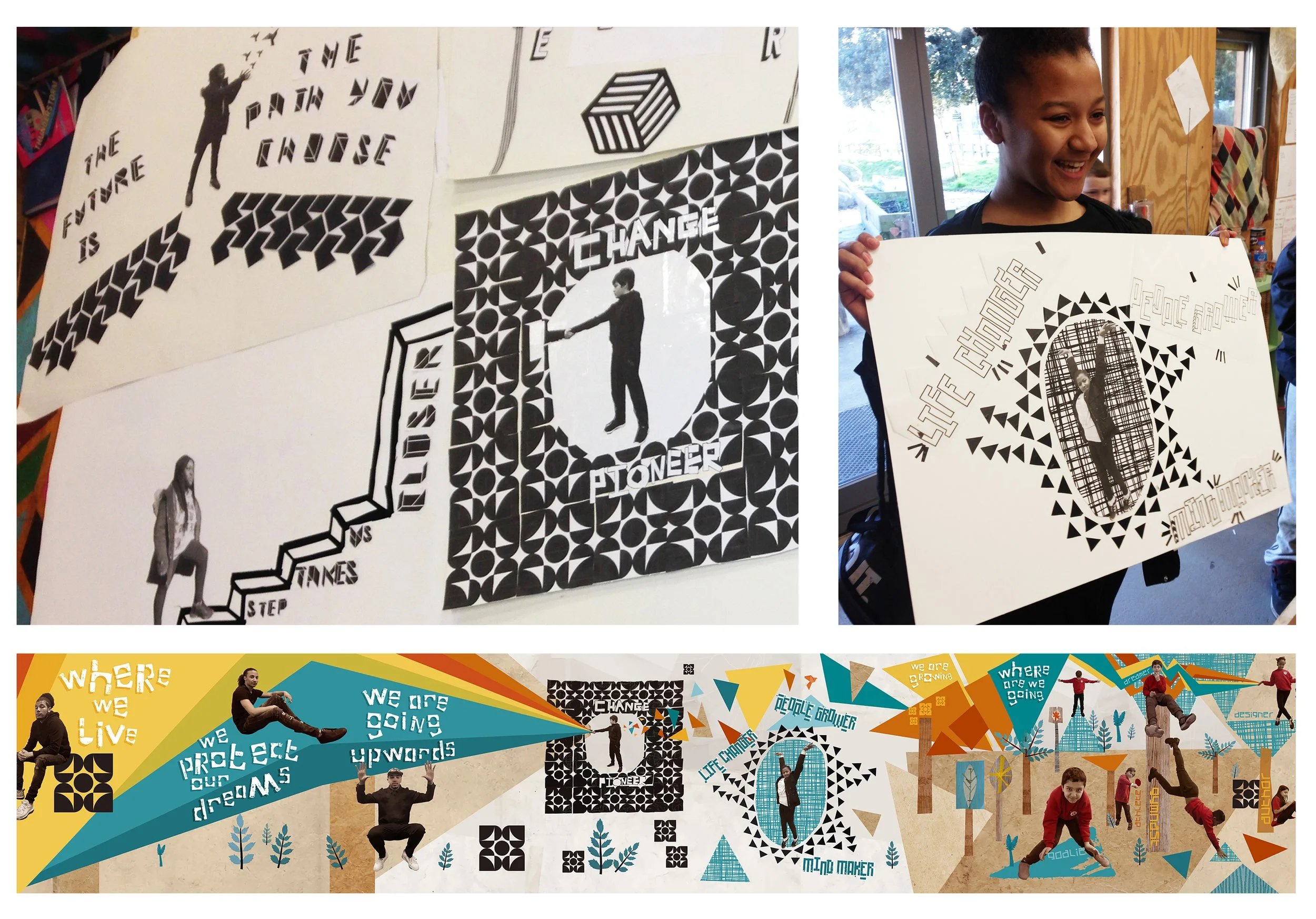 For the Essential Living Swiss Cottage Hoarding Project, we collaborated with 6 local young people’s groups through a series of 24 creative workshops. Each group responded to a different simple brief creating innovative artworks that would feed directly into the final design of the hoardings. The title of the project: ‘We’re Growing… Where Are We Going?” focused on each young person’s journey, championing their possibilities and potential as well as showcasing their creativity. As much as the physical environment, the future of Swiss Cottage is its young people, nurturing their potential and the future they wish to build.