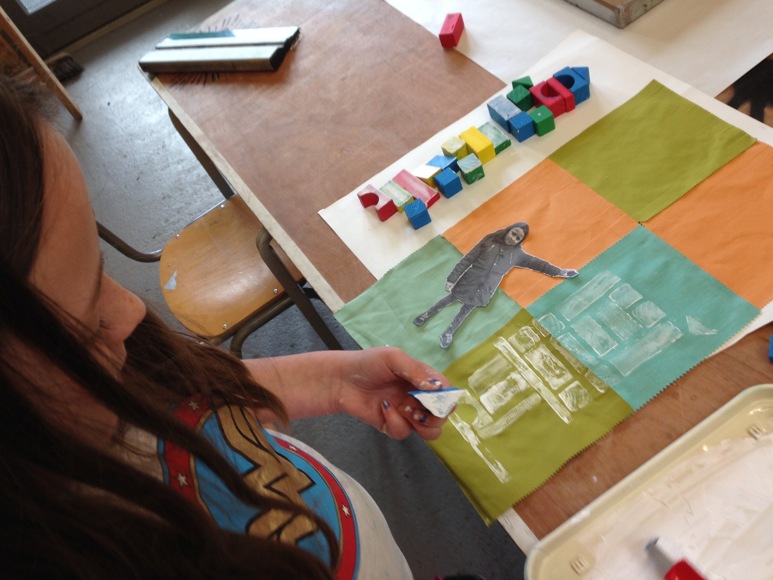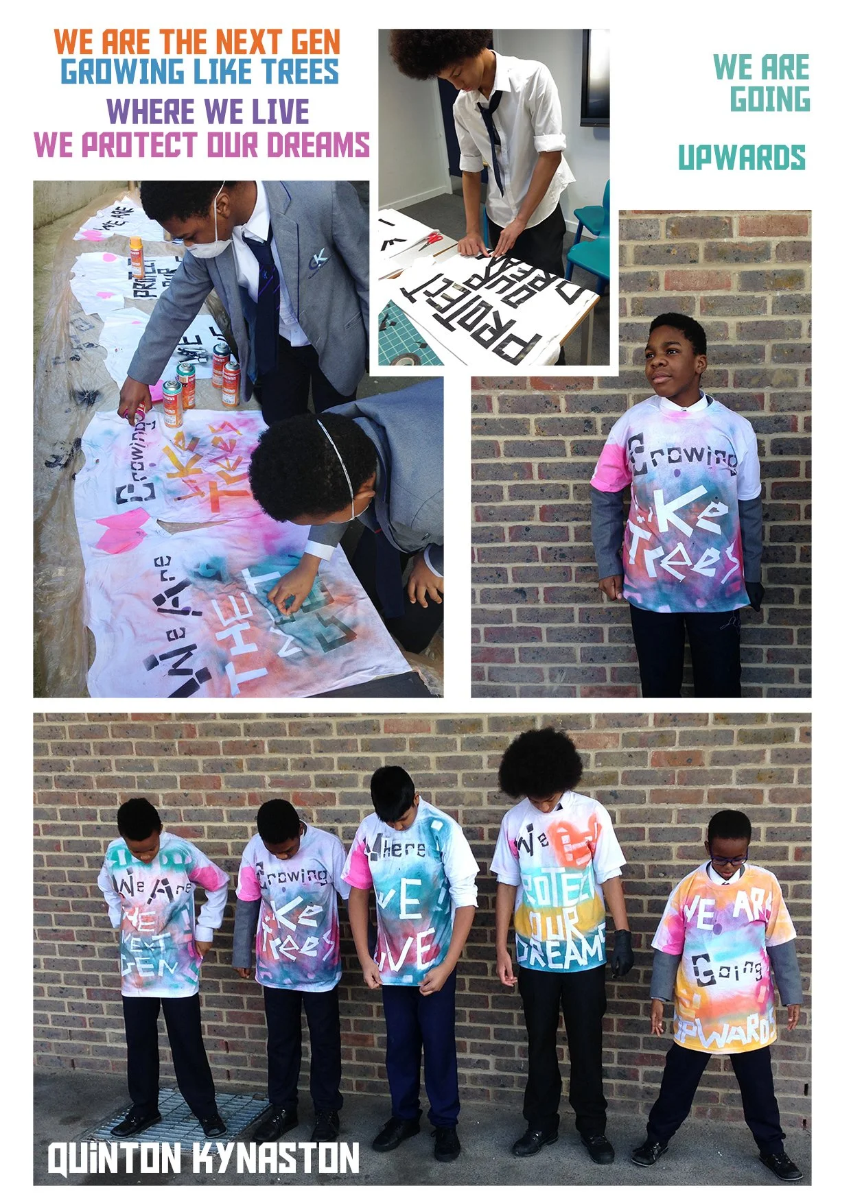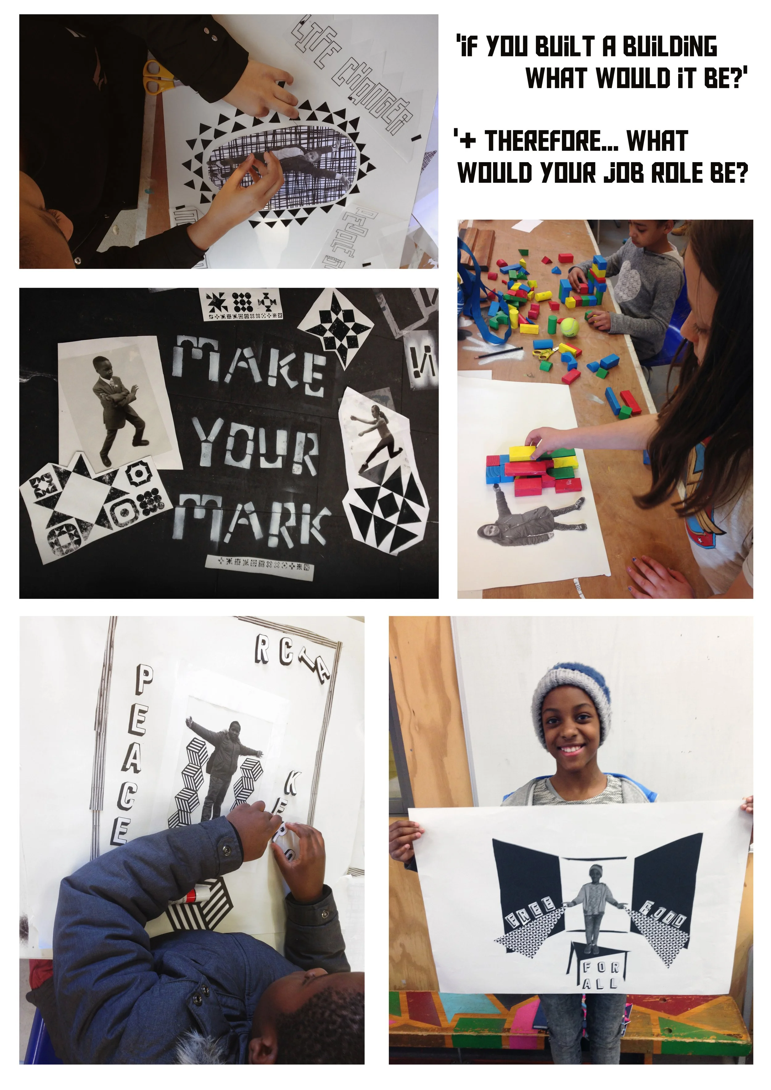 At Quintin Kynaston, the 4 practical workshops initially looked at building literally, using building blocks to create an alphabet font to be used across the hoarding designs. We then developed this further to create a poem inspired by the title, and designed these words to travel across a series of t-shirts.